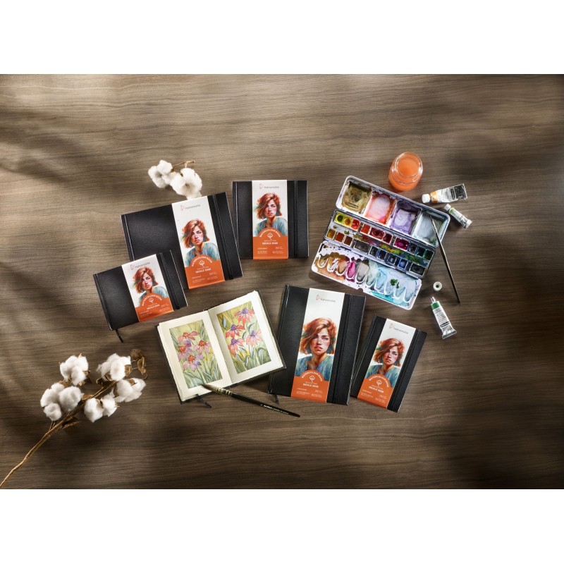 Aquarelboek 100% katoen met stevige zwarte kaft. Ingebonden en voorzien van een elastiek om het boek te sluiten. Inhoud: 30 vellen (250gr/m²) zuurvrij papier met een zachte fijne korrel. Formaat: landschap A4