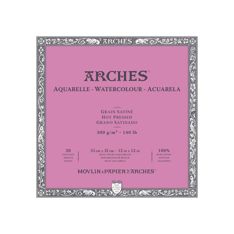 Arches aquarelpapier - Satijn korrel / hot pressed (100% katoen) Blok (gelijmd aan de korte zijde) met 15 vellen - 185gr/m²Verkrijgbaar in formaten: A4 (21x29,7cm) en A3 (29,7x42cm)