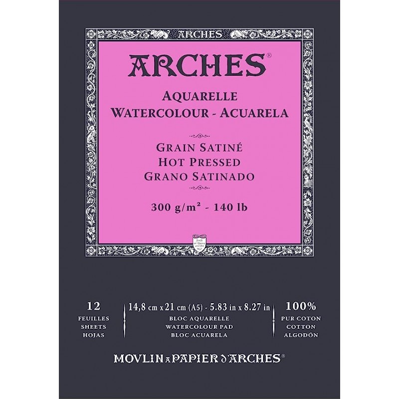 Arches aquarelpapier - Satijn korrel / hot pressed (100% katoen) Blok (gelijmd aan de korte zijde) met 15 vellen - 185gr/m²Verkrijgbaar in formaten: A4 (21x29,7cm) en A3 (29,7x42cm)