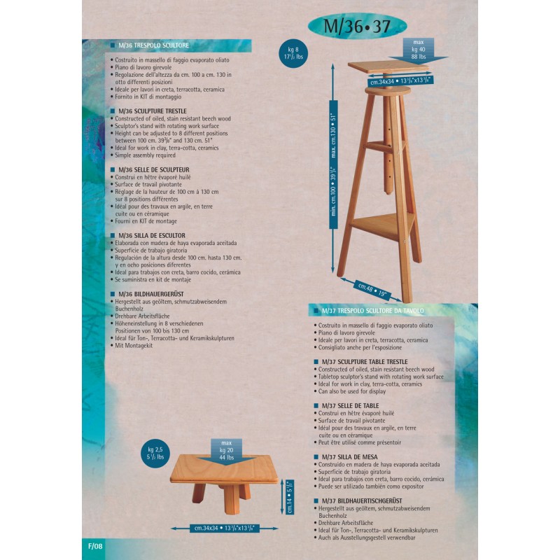 M/36 - boetseerbok in geolied beukenhout. Bevat een roterend werkvlak, is in hoogte verstelbaar en kan een gewicht dragen van maximum 40kg.