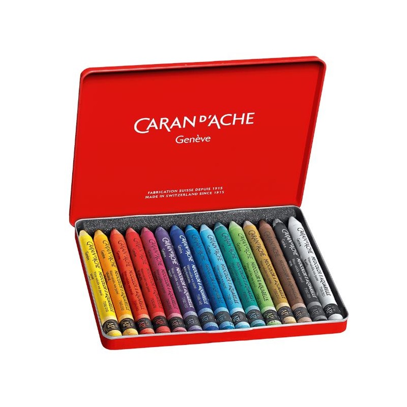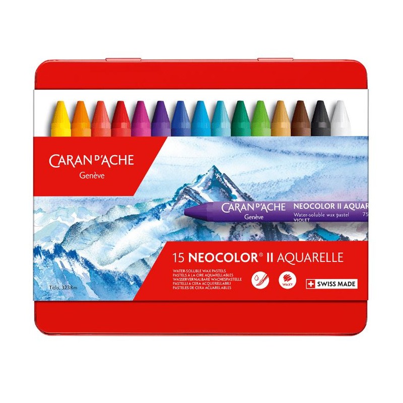 Caran d'Ache metalen etui met 15 kleuren Neocolor II Aquarelle wateroplosbare waskrijtjes.