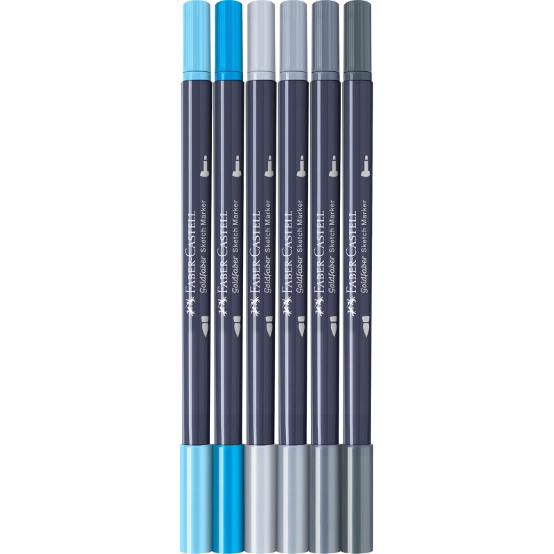 Faber-Castell Goldfaber Sketch Marker set Car Design Selectie van 6 kleuren markers op alcoholbasis met twee punten: brush en fineliner (0.6) In deze set kleurnummers: 118, 240, 331, 242, 335, 336