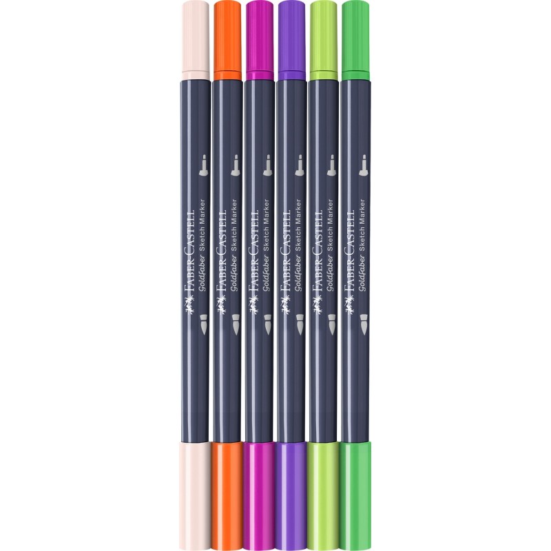Faber-Castell Goldfaber Sketch Marker set Product Design Selectie van 6 kleuren markers op alcoholbasis met twee punten: brush en fineliner (0.6) In deze set kleurnummers: 164, 449, 241, 242, 243, 244