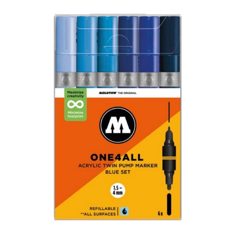 Molotow refill 30ml - True Blue 204 Het duurzame ONE4ALL acrylmarkersysteem is gebouwd om na te vullen en is altijd betrouwbaar in al zijn functies. Acrylbasis, hoge dekkracht, permanent * goede UV-bestendigheid voor bijna alle ondergronden (test ondergrond geschiktheid) beschikbaar in 50 kleuren mengbaar * voor decoratieve doeleinden