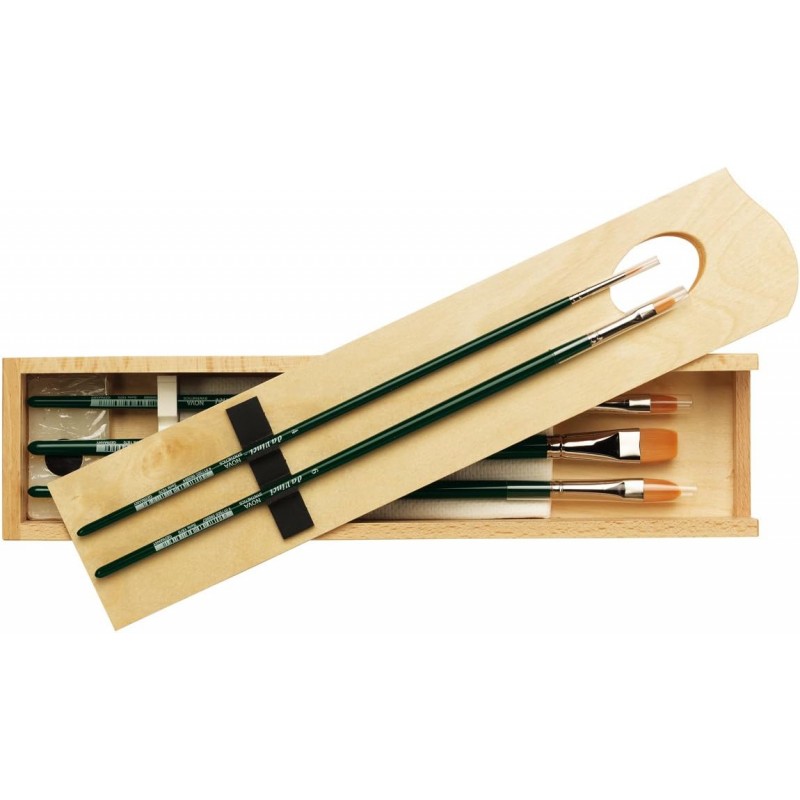 houten kistje met een assortiment van 5 synthetische penselen (met lange steel) voor olie-& acrylverf.