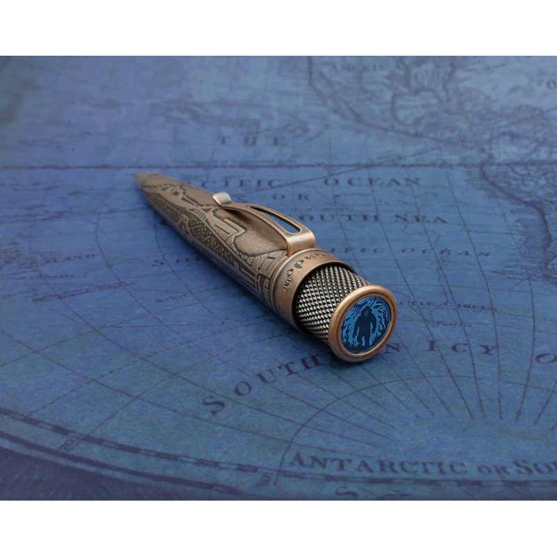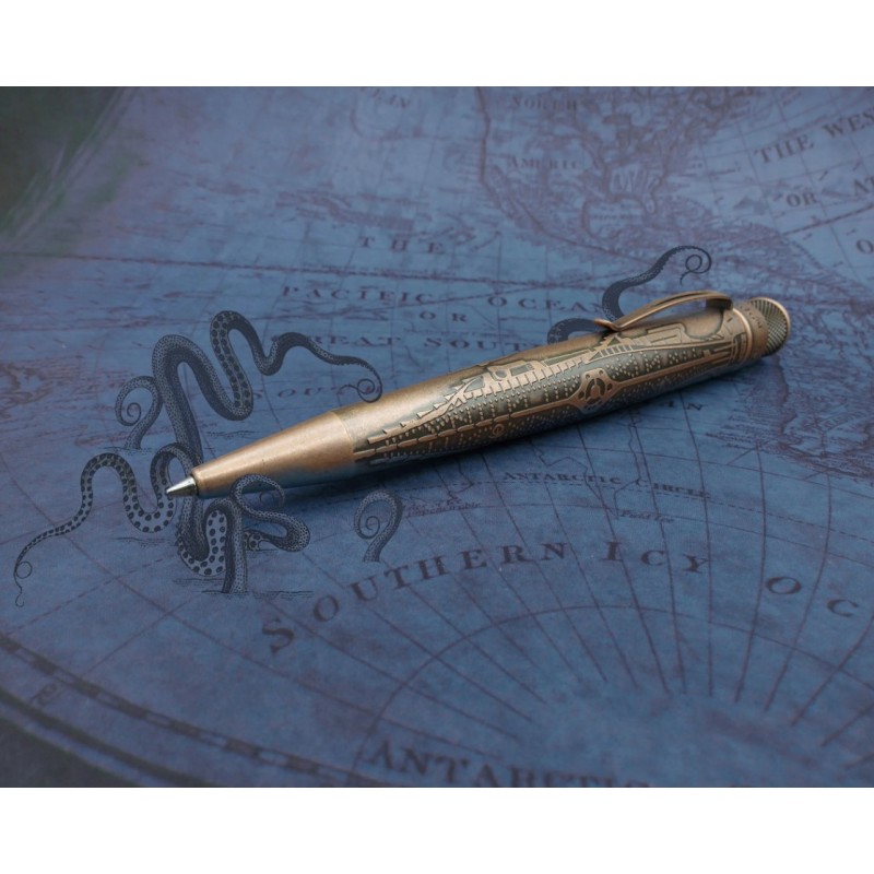 Dat bruisende leven begint op de verpakking, versierd met foliedruk afbeeldingen die doen denken aan een vintage boekomslag. Ervaar het gewicht, de dikker opliggende klinknagels, panelen en details van de onderzeeër, geëtst in de houder en afgewerkt met stonewashed koper; deze pen straalt een aura van avontuur uit, net als het raadselachtige schip.