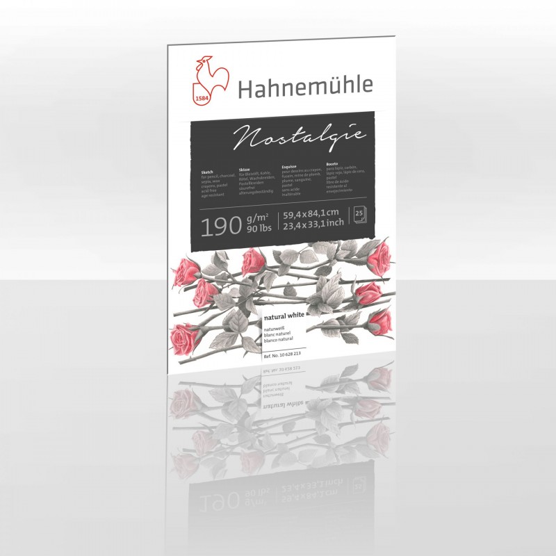 Het Nostalgie papier voelt stevig en tegelijkertijd soepel aan. Door de fijne korrel glijden potloden bijna vanzelf over het oppervlak. Duidelijk gedefinieerde lijnen en delicate arceringen maken alle types werk mogelijk, van bouwkundige schetsen tot kleurrijke tekeningen. Geschikt voor alle droge technieken en ook voor wassingen.